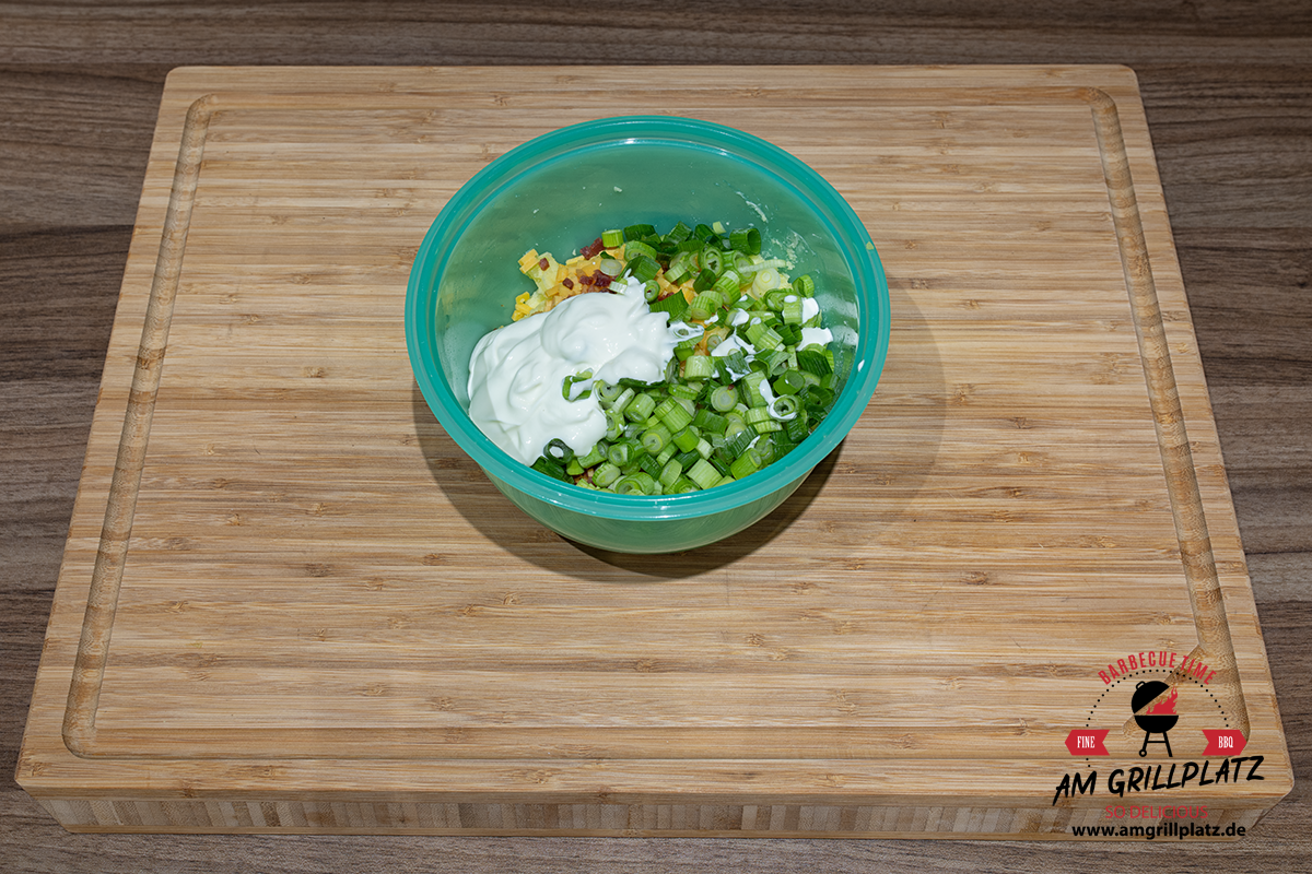 Cheddar, Lauchzwiebeln, Speck und den Sauerrahm unter die Kartoffelbuttermasse heben und mit Salz, Pfeffer und etwas Muskat abschmecken.