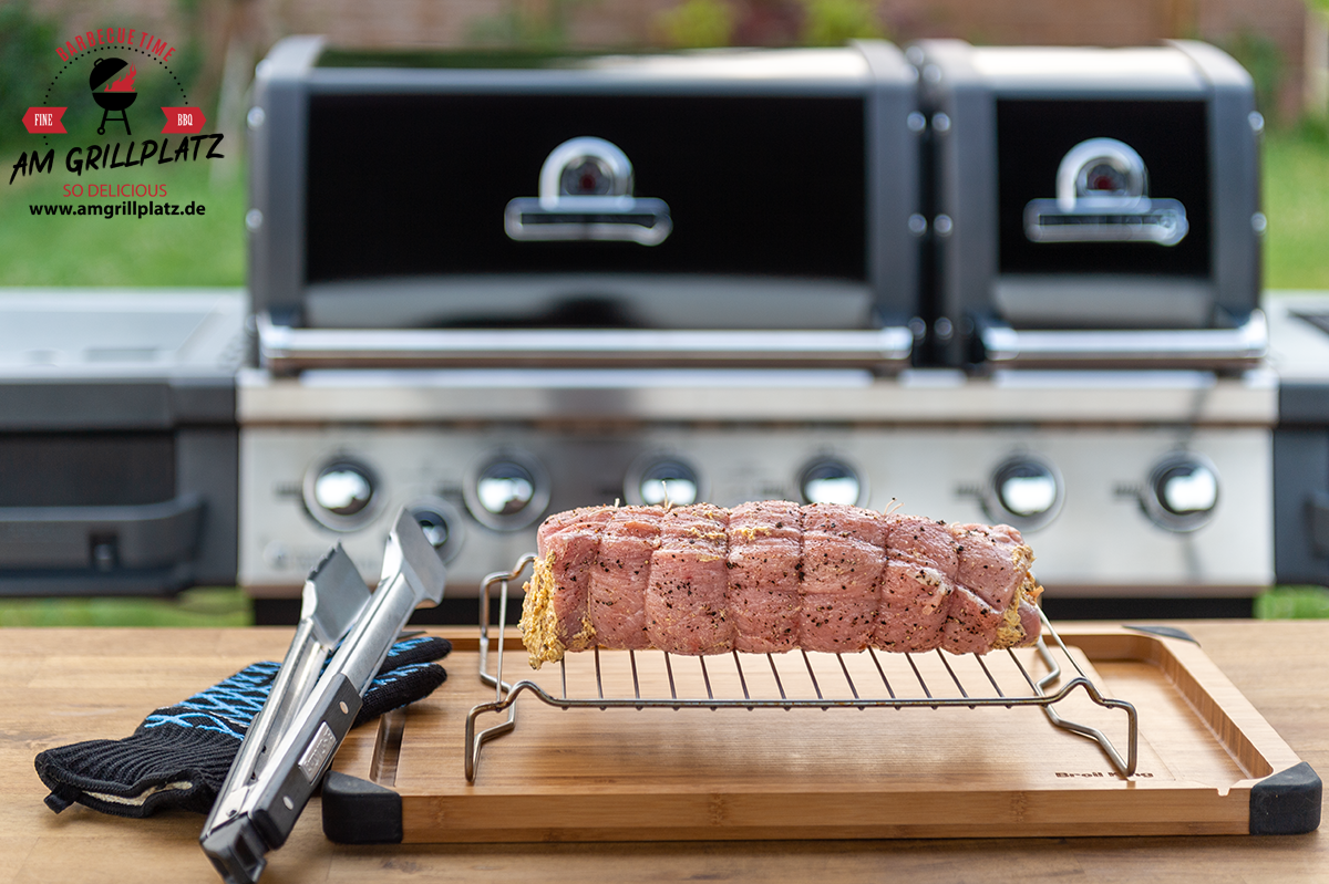 Die Schale kommt nun in den indirekten Bereich auf dem Grill und in die dickste Stelle des Fleisches kommt noch ein Kerntemperaturfühler*.