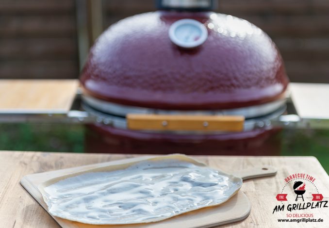 Kurz bevor der Grill die Temperatur erreicht hat, den ersten Flammkuchenboden aus der Kühlung nehmen und die Schmand-Sahne Soße großzügig darauf verteilen.