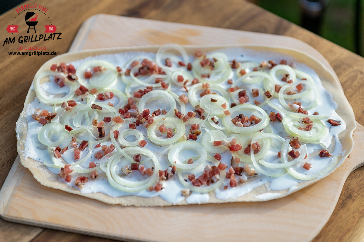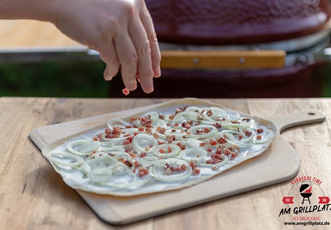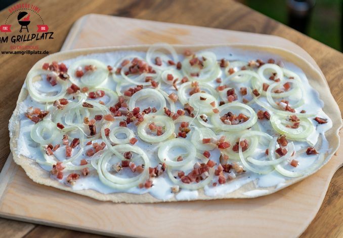 Den Flammkuchen auf den Pizzastein legen und nach ca. 2-3 Minuten ist der erste Elsässer Flammkuchen fertig und der nächste kommt in den Grill.