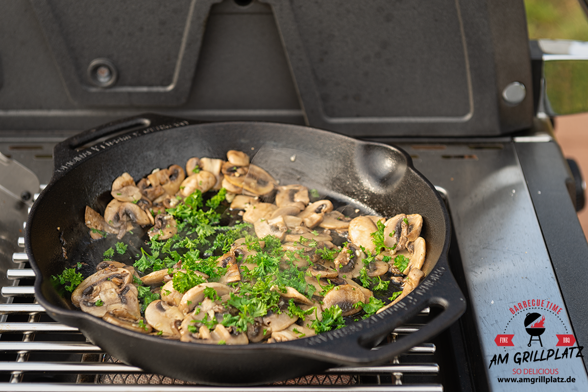 Auf den Seitenbrenner meines Broil Kings erhitze ich eine Gusseiserne Pfanne*. Sobald die Pfanne heiß ist, kommt ein wenig Öl in die Pfanne und ich brate darin die Champignons an. Sobald diese ein wenig Farbe bekommen haben, kommt die Butter und eine gepresste Knoblauchzehe hinzu. Alles unterrühren, bis die Butter geschmolzen ist. Dann die Petersilie hinzugeben, alles vermengen und dann in eine Schüssel umfüllen. Die brauchen wir später.