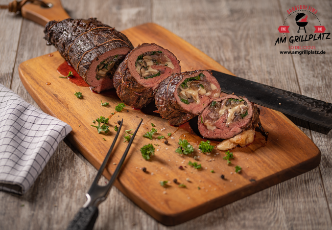 Sobald die Kerntemperatur erreicht ist, den Rollbraten vom Grill nehmen und 5 Minuten ruhen lassen.