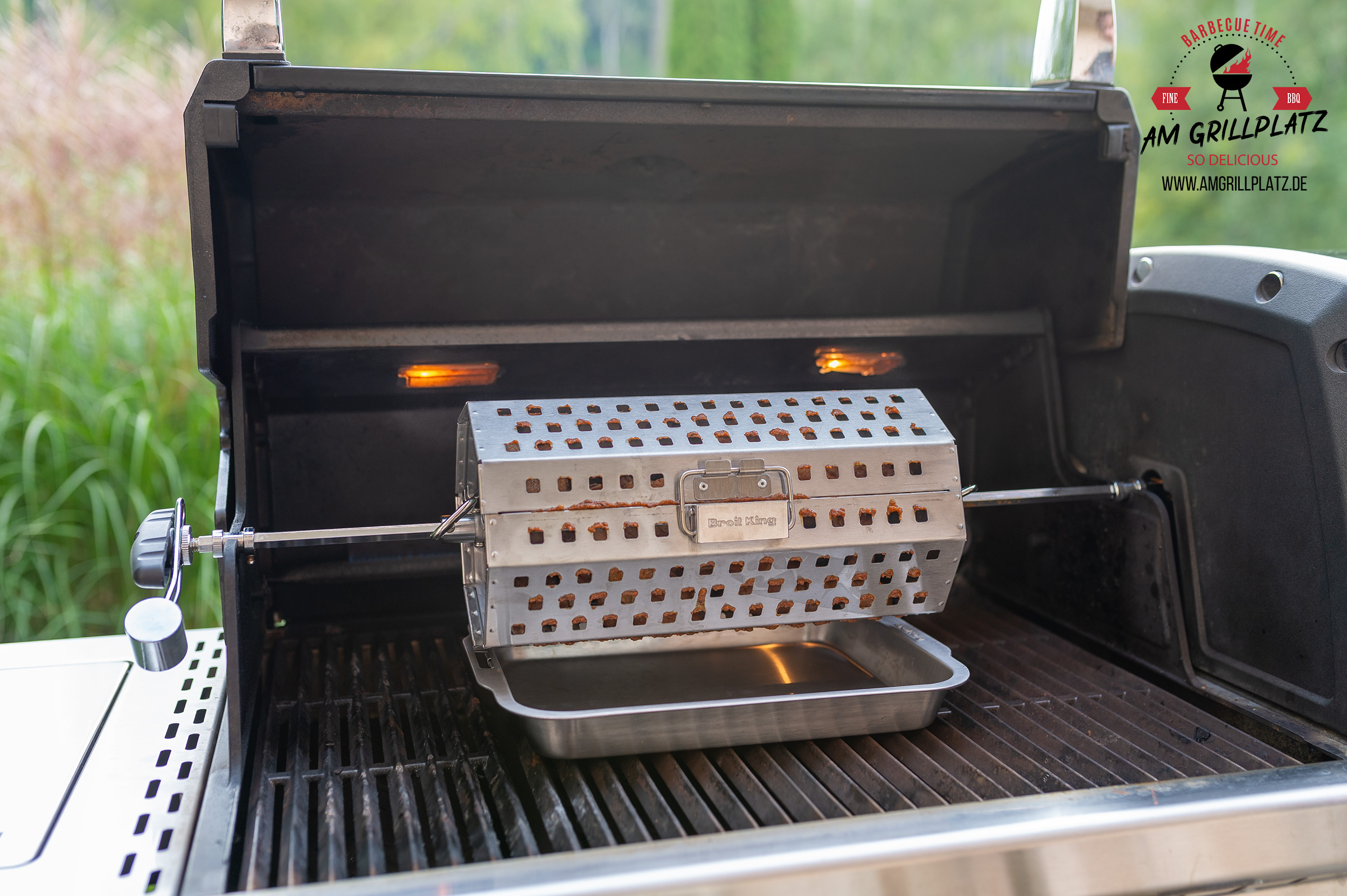 Die Chickenteile werden anschließend im Drehspieß-Korb gegrillt. Für diejenigen, die keinen solchen Korb besitzen, gibt es eine kurze Erklärung, wie es auch ohne geht.
